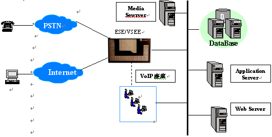 目前, ESE/VSE的主要應(yīng)用在呼叫中心平臺,PHS增值業(yè)務(wù)平臺,如短消息中心,預(yù)付費業(yè)務(wù),及其他各種信息處理平臺。
