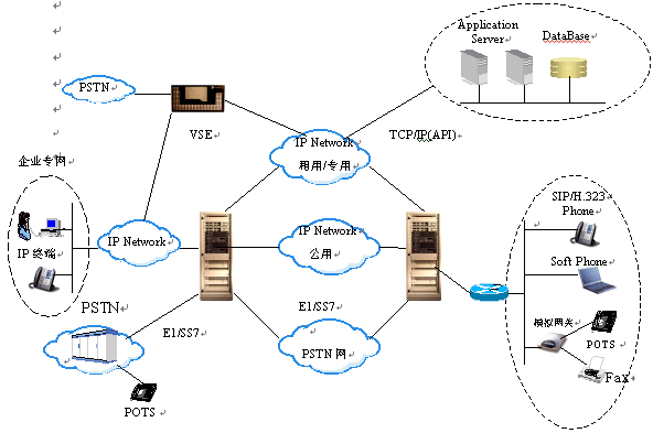 ESE/VSE作為電路到IP的接入網(wǎng)關(guān),可提供PSTN與IP網(wǎng)的互通。做為軟交換機,可建設(shè)全IP方式的電話網(wǎng)絡(luò),并實現(xiàn)呼叫處理,路由,業(yè)務(wù)實現(xiàn)等功能。