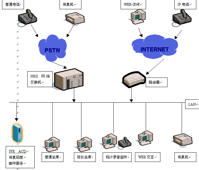 基于NBX 網(wǎng)絡交換機的呼叫中心對外部有PSTN和IP兩種接口,可以接入各種類型用戶:普通電話用戶、傳真用戶、WEB訪問用戶、IP電話用戶。NBX呼叫中心通過NBX網(wǎng)絡交換機將外部的PSTN信號轉換為以太網(wǎng)數(shù)據(jù)包信號,在呼叫中心內(nèi)部通過局域網(wǎng)提供話音與數(shù)據(jù)服務的集成,從而即以開放的局域網(wǎng)包交換技術實現(xiàn)專用 PBX的話音服務功能并與現(xiàn)有局域網(wǎng)無縫集成,從而實現(xiàn)包括E-mail、傳真、聊天工具、視頻以及話音在內(nèi)的由多種通信媒介的交互。NBX呼叫中心通過統(tǒng)一的ACD將各種通訊方式的訪問協(xié)調(diào)分配,最終實現(xiàn)了呼叫的中心運營和諧與高效。