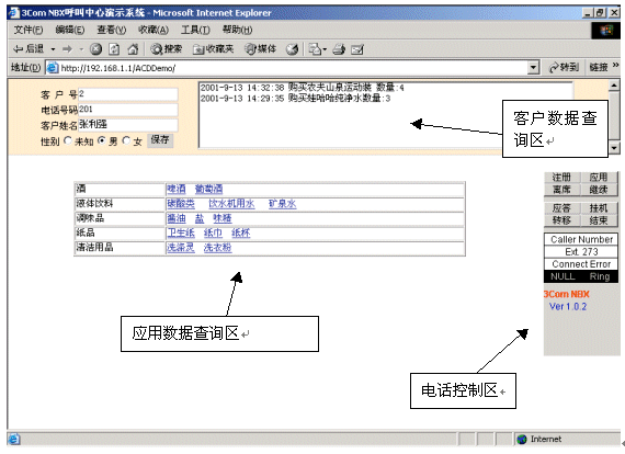 NV-AGENTControl和NV-AGENTPad。NV-AGENTControl是基于ActiveX的Ocx控件,利用該控件,第三方開發(fā)商可以自行開發(fā)界面,非常簡單地實現(xiàn)座席工號注冊、呼叫應答、電話外撥等功能。NV-AGENTPad是在NV-AGENTControl之上開發(fā)的一個座席應用解決方案,它通過瀏覽器方式運行,第三方開發(fā)商基本上可以不進行任何有關呼叫控制方面的開發(fā),就可以將自己的應用系統(tǒng)和NBX系統(tǒng)完整集成。