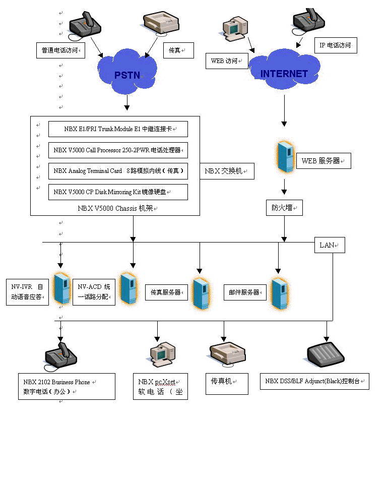 基于NBX的呼叫中心對外支持PSTN、IP兩種接入方式,可以實現(xiàn)各種接入:普通電話、傳真、IP電話、郵件、WEB訪問,NBX呼叫中心在技術上實現(xiàn)革命性的突破,在內(nèi)部實行語音數(shù)據(jù)兩網(wǎng)合一,將外部的模擬數(shù)據(jù)轉換為以太網(wǎng)數(shù)據(jù)包,由NV-ACD實現(xiàn)外部各種訪問的統(tǒng)一路由分配。