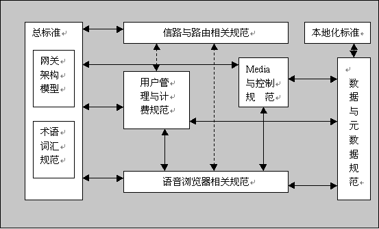 通過分析國際上各種語音網(wǎng)關(guān)系統(tǒng)極其技術(shù)規(guī)范,特別是參照 W3C組織的"Voice Browser" Activity的框架,我們認(rèn)為作為一個(gè)比較完整的語音網(wǎng)關(guān)標(biāo)準(zhǔn)體系,應(yīng)該包含以下具體標(biāo)準(zhǔn)規(guī)范的制定,通常稱之為標(biāo)準(zhǔn)需求。下圖顯示所需的規(guī)范類型及其相互關(guān)聯(lián)。