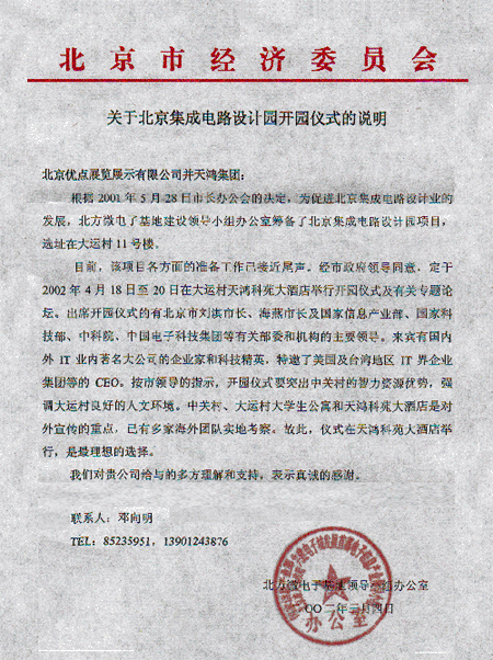 首屆呼叫中心運營管理研討會組委會 重要通告 本次大會組委會及會議舉辦地點“天鴻科園大酒店”日前接到北京市人民政府通知,由于“北京集成電路設(shè)計園開園儀式”將于2002年4月18日至4月20日在大運村、天鴻科園大酒店舉行開園儀式及相關(guān)活動,屆時將有北京市劉淇市長、海燕市長及國家信息產(chǎn)業(yè)部、國家科技部、中科院、中國電子科技集團(tuán)等有關(guān)部委和機(jī)構(gòu)的主要領(lǐng)導(dǎo)出席。按市領(lǐng)導(dǎo)指示,為配合此次重大活動圓滿舉行,“首屆呼叫中心運營管理研討會”日期更改為2002年4月23日至4月25日在北京天鴻科園大酒店舉行,望有關(guān)參會單位做好相應(yīng)的后續(xù)工作。特此通告! 組委會對有關(guān)參會單位的支持與配合表示真誠的感謝。 首屆呼叫中心運營管理研討會組委會