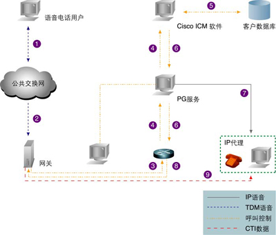 CallManager。(4)Cisco CallManager通過ICM PG把該路由申請送到ICM。(5)ICM檢查客戶的賬號信息,并通過對賬號信息的分析確定路由。(6)ICM調(diào)用一個客戶定義的路由腳本,以便選擇最合適的IPCC代理受理客戶的請求,并通過外設網(wǎng)關(PG)轉給目標CCM。(7)PG發(fā)送客戶信息數(shù)據(jù)到目標IPCC代理的桌面(在屏幕上彈出信息框)。(8)CCM指示VoIP網(wǎng)關連接客戶和目標代理。(9)VoIP網(wǎng)關建立語音連接。