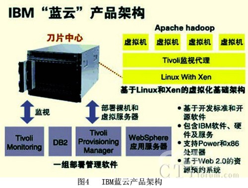 通過(guò)IBM的技術(shù)白皮書(shū),我們可以一窺藍(lán)云計(jì)算平臺(tái)的內(nèi)部構(gòu)造!八{(lán)云”建立在IBM大規(guī)模計(jì)算領(lǐng)域的專業(yè)技術(shù)基礎(chǔ)上,基于由IBM軟件、系統(tǒng)技術(shù)和服務(wù)支持的開(kāi)放標(biāo)準(zhǔn)和開(kāi)源軟件。簡(jiǎn)單地說(shuō),“藍(lán)云”基于IBM Almaden研究中心(Almaden Research Center)的云基礎(chǔ)架構(gòu),包括Xen和PowerVM虛擬化、Linux操作系統(tǒng)映像以及Hadoop文件系統(tǒng)與并行構(gòu)建!八{(lán)云”由IBM Tivoli軟件支持,通過(guò)管理服務(wù)器來(lái)確;谛枨蟮淖罴研阅。這包括通過(guò)能夠跨越多服務(wù)器實(shí)時(shí)分配資源的軟件,為客戶帶來(lái)一種無(wú)縫體驗(yàn),加速性能并確保在最苛刻環(huán)境下的穩(wěn)定性。IBM新近發(fā)布的“藍(lán)云(Blue Cloud)”計(jì)劃,能夠幫助用戶進(jìn)行云計(jì)算環(huán)境的搭建。它通過(guò)將Tivoli、DB2、WebSphere與硬件產(chǎn)品(目前是x86刀片服務(wù)器)集成,能夠?yàn)槠髽I(yè)架設(shè)一個(gè)分布式、可全球訪問(wèn)的資源結(jié)構(gòu)。根據(jù)IBM的計(jì)劃,首款支持Power和x86處理器刀片服務(wù)器系統(tǒng)的“藍(lán)云”產(chǎn)品將于2008年正式推出,并且計(jì)劃隨后推出基于System z“大型主機(jī)”的云環(huán)境,以及基于高密度機(jī)架集群的云環(huán)境。