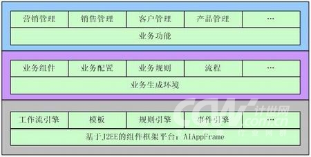 從總體上看AIOpenCRM定位為一個(gè)業(yè)務(wù)生成平臺(tái),它分為三個(gè)部分,一個(gè)基于各種中間件(AIAppFrame、WorkFolw、BusinessRule等)實(shí)現(xiàn)的業(yè)務(wù)生成環(huán)境,第二個(gè)是基于業(yè)務(wù)邏輯數(shù)據(jù)模型實(shí)現(xiàn)的業(yè)務(wù)對象,最后是基于業(yè)務(wù)生成環(huán)境以及業(yè)務(wù)對象實(shí)現(xiàn)的業(yè)務(wù)功能。它們都是基于J2EE技術(shù)進(jìn)行實(shí)現(xiàn)的。如下圖所示: