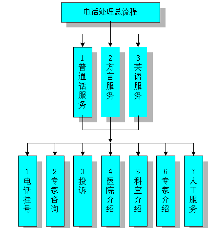 用戶撥號接入醫(yī)院呼叫中心后,系統(tǒng)自動向用戶播放語音提示:"您好,歡迎使用本醫(yī)院的電話服務中心,普通話服務請按1,方言(廣東話)服務按2,英語服務按3。"
