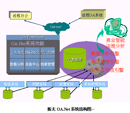 新太OA.Net系統(tǒng)基于最新的B/S三層體系結(jié)構(gòu)開發(fā),采用關(guān)系型數(shù)據(jù)庫(kù)(SQL Server,Oracle等)結(jié)合群件系統(tǒng)(Exchange、Domino等)的方式,在保證系統(tǒng)高穩(wěn)定性的基礎(chǔ)上充分發(fā)揮了系統(tǒng)的靈活性?蛻舳嘶跒g覽器,無需安裝軟件,版本自動(dòng)更新到客戶端,大大降低了系統(tǒng)維護(hù)的難度。