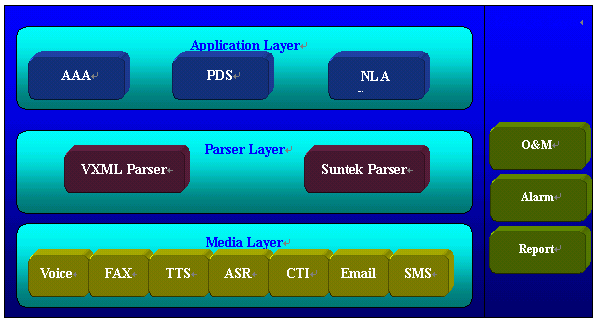 SSurnon-IVR系統(tǒng)分為支撐系統(tǒng)和應(yīng)用服務(wù)器兩大部分,支撐系統(tǒng)的核心為Browser Layer。由它來(lái)解釋和執(zhí)行流程的業(yè)務(wù)邏輯,由Media Layer提供具體的操作,主要是管理語(yǔ)音、傳真、IP等資源,對(duì)Browser Layer屏蔽掉硬件的區(qū)別,提供統(tǒng)一的接口,以插件的形式提供各種功能。在它們之外還有配置管理、維護(hù)監(jiān)控、告警管理、統(tǒng)計(jì)報(bào)表等。應(yīng)用服務(wù)器部分包括外呼管理、數(shù)據(jù)庫(kù)中間件,傳真網(wǎng)關(guān)、自然語(yǔ)音理解引擎等。具體的結(jié)構(gòu)見下圖: