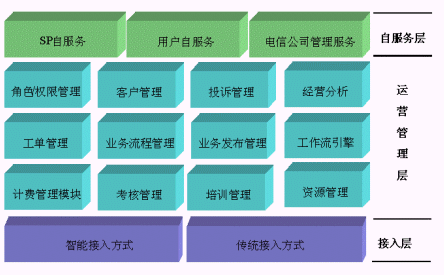 SP統(tǒng)一管理系統(tǒng)從功能邏輯上劃分,我們歸納為三大功能層來對系統(tǒng)進行總體的介紹:接入層、運營管理層、自服務層。如下圖所示: