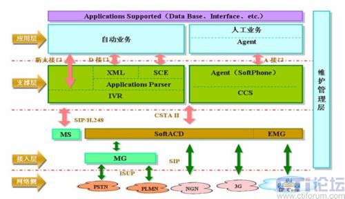 接入層:SoftACD與下面的網(wǎng)絡(luò)資源的協(xié)議接口層。包括所有網(wǎng)絡(luò)資源和特殊資源,如SoftSwitch、MS等。