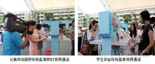 這次在廣州大學(xué)城開(kāi)展的發(fā)布會(huì),吸引了很多在校大學(xué)生的參加,下圖是記者和學(xué)生現(xiàn)場(chǎng)體驗(yàn)通過(guò)悅視高清視頻通話玩即時(shí)猜拳游戲,傳輸?shù)乃挟?huà)面非常清晰流暢,悅視產(chǎn)品的優(yōu)質(zhì)體驗(yàn)讓人享受無(wú)線高質(zhì)量流媒體服務(wù)的同時(shí)深刻感受到TD-LTE高帶寬、低時(shí)延的優(yōu)勢(shì)。