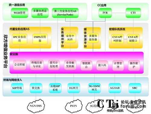 可在此基礎(chǔ)上提供形成了多媒體呼叫中心、IPPBX、IPCentreX、IVR/IVVR二次開(kāi)發(fā)平臺(tái)、一號(hào)通、即時(shí)消息/呈現(xiàn)等一系列的重量級(jí)新型業(yè)務(wù),同時(shí)其所提供的業(yè)務(wù)開(kāi)發(fā)能力允許第三方自主的研發(fā)和部署的業(yè)務(wù)應(yīng)用,滿足業(yè)務(wù)應(yīng)用的個(gè)性化需求。