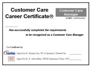 學(xué)員在經(jīng)過完整的課程培訓(xùn)之后,經(jīng)考試合格,可以獲得由美國俄亥俄州立大學(xué)與太維資訊有限公司聯(lián)合頒發(fā)的的專業(yè)培訓(xùn)證書?蛻舴⻊(wù)中心認(rèn)證的目的有兩個(gè):首先,對于已經(jīng)在客服中心從業(yè)的人員,太維公司的培訓(xùn)可以提供一個(gè)提升他們工作能力的機(jī)會,通過培訓(xùn)后不同層次的專業(yè)培訓(xùn)認(rèn)證,太維公司以行業(yè)的標(biāo)準(zhǔn)要求對他們的提升加以證明,以加強(qiáng)他們在行業(yè)中的競爭能力。其次,對于有志致力于在客戶服務(wù)行業(yè)從業(yè)的人事,太維公司廣泛深入、滿足各種需求的專門技術(shù)培訓(xùn)與相應(yīng)的不同層次的認(rèn)證,為他們進(jìn)入該行業(yè)提供一個(gè)標(biāo)準(zhǔn)的素質(zhì)證明,以使他們能夠順利勝任客戶服務(wù)中心的各種主要的工作職位。