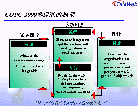 COPC-2000®標準提供呼叫中心規(guī)劃與領導、流程管理、人員管理、績效考核四大類32項指標的評估基準,內(nèi)容涵蓋財務成本、客戶滿意度、客戶投訴、服務與質(zhì)量、組織結(jié)構、人力資源運用、員工考核及士氣等呼叫中心管理的所有方面。具體架構見下圖。