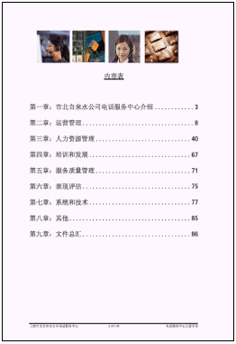 b) 現(xiàn)代客戶(hù)服務(wù)中心的管理框架已經(jīng)基本形成。我們?yōu)槭斜弊詠?lái)水客戶(hù)服務(wù)中心編輯了一套呼叫中心運(yùn)營(yíng)管理手冊(cè),其中分為經(jīng)理版和客戶(hù)服務(wù)代表版,其中包含了呼叫中心的規(guī)章制度,運(yùn)作流程,人力資源管理等內(nèi)容。