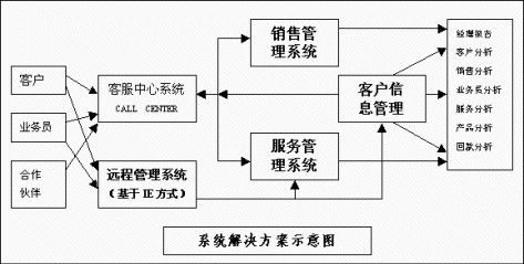 易達(dá)CRM在提供客戶信息管理、銷售管理、潛在客戶管理和服務(wù)管理基礎(chǔ)上,還充分集成了低價(jià)位的呼叫中心系統(tǒng)(Call center),以及基于IE方式的遠(yuǎn)程處理系統(tǒng),其功能框圖如下: