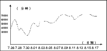 延吉通信從7月10日開始正式作宣傳,8月1日后每天時(shí)長(zhǎng)均保持在55000分鐘以上。最新統(tǒng)計(jì)表明,自2002年7月至今,該業(yè)務(wù)已為延吉通信公司創(chuàng)造2500萬分鐘以上的市話增值。