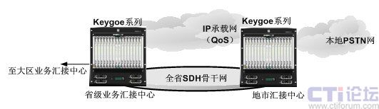 利用東進Keygoe系列多媒體交換機構(gòu)建全省乃至于全國的綜合增值業(yè)務(wù)平臺,實現(xiàn)業(yè)務(wù)的全省或全國的統(tǒng)一運營。通過分布在不同地區(qū)的東進Keygoe系列多媒體交換機實現(xiàn)業(yè)務(wù)的負載均衡、業(yè)務(wù)能力的冗余備份。其結(jié)構(gòu)圖如下圖所示。