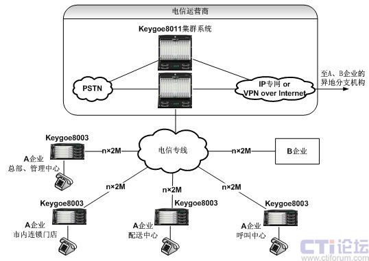 電信運營商在核心機房部署由東進Keygoe系列多媒體交換機組成的高性能集群交換機系統(tǒng),各個企業(yè)以及各企業(yè)的市內(nèi)分支機構(gòu)(如管理中心、連鎖門店、配送中心、呼叫中心等)分別配置東進Keygoe系列多媒體交換機,并通過電信運營企業(yè)的2M專線(E1中繼)方式上聯(lián)到電信運營商核心機房的交換機集群系統(tǒng),組成一個以集群交換機系統(tǒng)為核心的星形網(wǎng)絡(luò)(如上圖所示)。所有的市話呼入和呼出都通過核心節(jié)點和電信運營商的中繼通道,為連鎖型商業(yè)企業(yè)提供內(nèi)部話音通訊的統(tǒng)一編號、統(tǒng)一撥號、統(tǒng)一維護和管理,企業(yè)對外公布統(tǒng)一和便于記憶的號碼,實現(xiàn)企業(yè)管理、營銷和客戶服務(wù)的統(tǒng)一化和規(guī)范化。核心機房的高性能集群交換機系統(tǒng)充分考慮冗余備份,如模塊和整機設(shè)備的雙冗余,從而提高整個通信平臺的高可用性和高可靠性。各個分支的多媒體交換機具備本地的獨立工作能力,即使在中繼線路出現(xiàn)故障的情況下,也能正常的工作。同時,Keygoe系列多媒體交換機集成了7號信令、會議、傳真、語音等豐富的多媒體處理資源,可以為用戶開發(fā)靈活多樣的智能業(yè)務(wù)和增值業(yè)務(wù),豐富了系統(tǒng)的應(yīng)用。