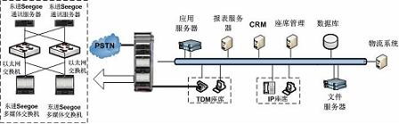 系統(tǒng)整體采用集中式架構(gòu),呼叫中心平臺采用東進公司基于Yessoe技術(shù)開發(fā)的Seegoe多媒體交換機和Seegoe通信服務(wù)器。呼叫中心平臺與物流公司內(nèi)部的物流管理系統(tǒng)(如LM、SCM)通過TCP/IP進行結(jié)合。呼叫中心系統(tǒng)具有豐富的媒體資源和強大的處理能力,并提供功能模塊的N+1全冗余備份,滿足了高負荷、大并發(fā)和關(guān)鍵業(yè)務(wù)的可靠運營。其次,Seegoe呼叫中心平臺在媒體交換層以全新的IP架構(gòu)實現(xiàn)網(wǎng)絡(luò)融合、應(yīng)用融合和業(yè)務(wù)融合,能夠很好的滿足電視購物行業(yè)對呼叫中心的要求。
