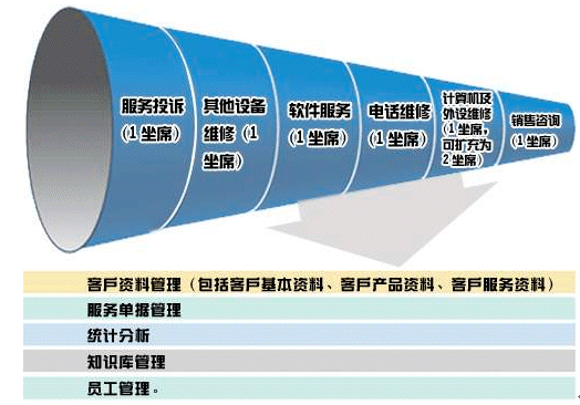 每個部門負責管理自己的座席、收集客戶資料,按本部門的服務流程實施客戶服務,每個部門的相關人員只能進入自己所屬的模塊,管理本部門的資料。上級部門可看到所有資料。
