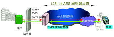鑒于用戶目前正使用互聯(lián)網郵件系統(tǒng),愛立信提供了EMO Email Push互聯(lián)網版解決方案。方案需要將Email Push應用的用戶在愛立信EMO接力服務器上注冊,同時在用戶的手機上安裝客戶端軟件即可;