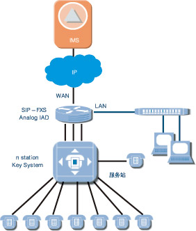 適用于支持模擬線的小交換機,經(jīng)SIPIAD設(shè)備將模擬線路轉(zhuǎn)換為基于IP的SIP信令流和媒體流,接入IMS系統(tǒng)。經(jīng)愛立信測試認(rèn)證過的IAD產(chǎn)品有Mediatrix、Audiocodes、Linksys等。