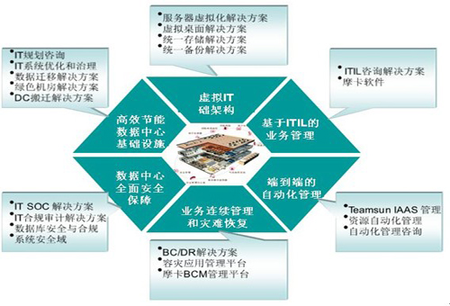 圍繞云計(jì)算數(shù)據(jù)中心的建設(shè),華勝天成共開(kāi)發(fā)了多個(gè)解決方案,且每個(gè)解決方案均有專業(yè)的售前支持團(tuán)隊(duì)和售后實(shí)施團(tuán)隊(duì),這些解決方案不是分散而無(wú)關(guān)的,而是針對(duì)用戶的不同情況,在各方面均給予綜合考慮,以最優(yōu)的設(shè)計(jì)方案來(lái)滿足用戶的需要,并兼顧另外方面的后繼需求。