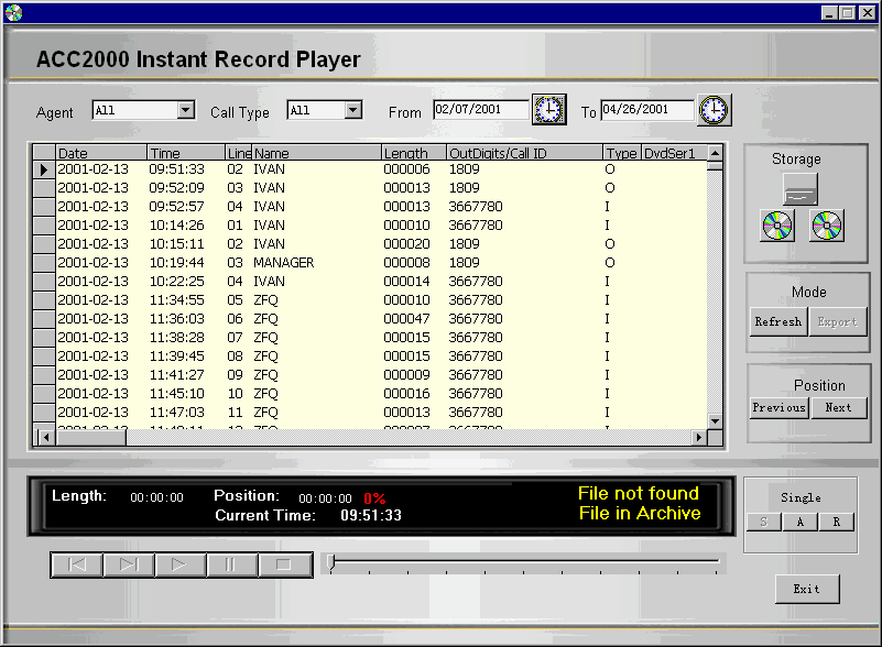 ACC2000 多媒體溝通中心采用最先進的海量存儲設(shè)備DVD RAM構(gòu)建實時多通道語音錄制、備份系統(tǒng)��ACC2000 DVD Record Backup。這個系統(tǒng)可以根據(jù)管理員設(shè)定的錄音對象,對符合錄音條件的通話自動進行錄音!
