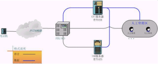 上圖是客服中心較常見的結(jié)構(gòu)圖,相當(dāng)于將初級(jí)客服的CT-Server服務(wù)器一分為三。原來的語(yǔ)音板卡由現(xiàn)在真正的PBX替代,青牛USE和青牛ATS則是從CT-Server軟件包中獨(dú)立出來,強(qiáng)化各自的核心功能,運(yùn)行在兩臺(tái)單獨(dú)的服務(wù)器上(IVR服務(wù)器還是需要語(yǔ)音板卡來處理話路,但語(yǔ)音板卡已經(jīng)不負(fù)責(zé)PBX的交換功能了)。這種類型的客服中心可以給客戶更大規(guī)模的、更穩(wěn)定的服務(wù),并且撥入電話的客戶感覺不到系統(tǒng)的變化。