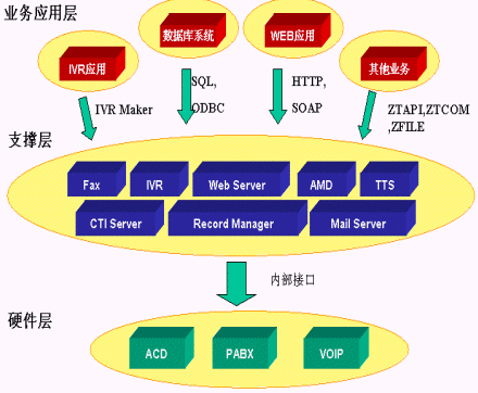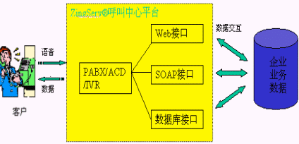 SQL Server,MySQL等多種數(shù)據(jù)庫;通過HTTP調(diào)用第三方WEB程序,通過SOAP協(xié)議調(diào)用Web Server上的服務(wù),從而利用外部應(yīng)用進一步加強IVR的功能;用戶只需做一些簡單配置就可以實現(xiàn)電話訪問數(shù)據(jù)庫、WEB和業(yè)務(wù)系統(tǒng)。如圖所示: