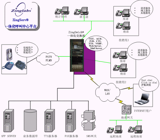 那么,如何才能提供客戶滿意的服務(wù)呢?利用ZingServ®,當一個客戶進入系統(tǒng)時,系統(tǒng)自動將其接通到一個最能解決其問題的座席上,且在呼叫到達座席的同時,該客戶的詳細資料和服務(wù)需求也同時顯示在該座席的屏幕上。在座席開始與用戶交流之前,座席已經(jīng)了解了客戶的身份、客戶的具體需求,因此,座席可以迅速準確地為客戶提供服務(wù)。如此人性化的服務(wù)肯定能讓用戶滿意。在介紹ZingServ®之前,讓我們先來了解一些基本的概念(如果您是專業(yè)人士,請直接閱讀第二章)。