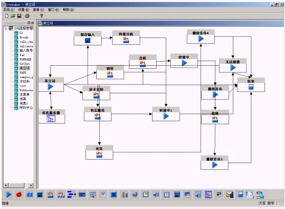 IVR Maker是一個圖形化的業(yè)務(wù)流程生成環(huán)境,通過它可以生成新的IVR自動業(yè)務(wù)流程或維護舊的流程,生成的流程能夠在線調(diào)試,調(diào)試好的流程可以在線加載到IVR上運行。