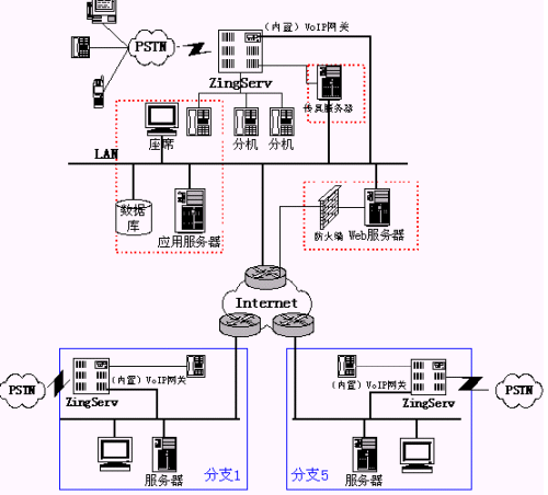 目前清華誠志數(shù)碼公司分支機構有5個,可以通過ZingServ交換機的內置VoIP功能在5個分支機構實現(xiàn)組網(wǎng),從而大大節(jié)省長話費用,并實現(xiàn)內部分機號統(tǒng)一編碼: