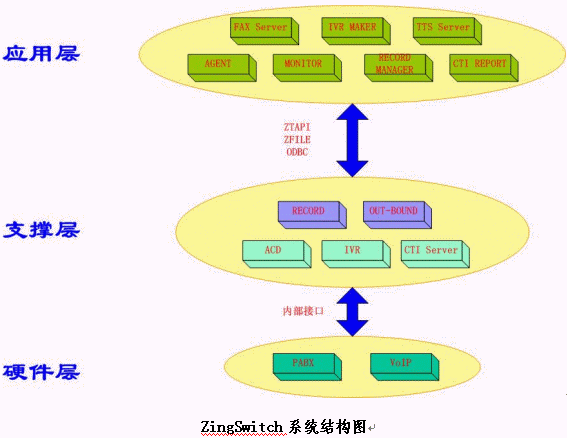 在以上三層結(jié)構(gòu)中,前兩層與具體業(yè)務(wù)系統(tǒng)無關(guān)。上層業(yè)務(wù)系統(tǒng)的多種變化,不會影響下層的穩(wěn)定;而下層規(guī)范地進(jìn)行優(yōu)化和擴(kuò)展后,上層的所有應(yīng)用都可在業(yè)務(wù)功能上得到擴(kuò)展。這樣,用戶的業(yè)務(wù)應(yīng)用系統(tǒng)自身可以有多種功能和性能的變動和擴(kuò)展,同時(shí),當(dāng)基于ZingSwitch一體化交換機(jī)的呼叫中心系統(tǒng)平臺在進(jìn)行擴(kuò)容、升級的時(shí)候,原來已經(jīng)無縫掛接其上的用戶的業(yè)務(wù)應(yīng)用系統(tǒng)也無需任何更改即可運(yùn)行。