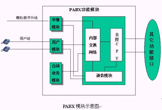 PABX模塊采用了三級分布分散的控制方式,這三級由主控板級、通訊控制級和各功能模塊級組成。各功能模塊單板實(shí)現(xiàn)各功能板的自身控制,通訊控制級模塊主要負(fù)責(zé)主控板級和各功能模塊級之間的數(shù)據(jù)通訊,實(shí)現(xiàn)主控板對各功能模塊的協(xié)調(diào)和控制。模塊內(nèi)部采用了先進(jìn)的內(nèi)存管理技術(shù)、先進(jìn)的通信方式和先進(jìn)的控制方式,因而獲得了極高的CPU通訊帶寬和處理能力。