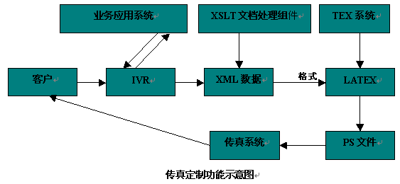 用戶通過(guò)IVR與業(yè)務(wù)應(yīng)用系統(tǒng)交互,獲得所需的傳真數(shù)據(jù),這些傳真數(shù)據(jù)在系統(tǒng)中以XML數(shù)據(jù)的格式存在,系統(tǒng)然后調(diào)用XSLT(英文縮寫(xiě),XSLT是語(yǔ)言,專(zhuān)門(mén)處理XML數(shù)據(jù),通過(guò)一段XSLT程序可以將XML數(shù)據(jù)轉(zhuǎn)換成其他的形式的文檔,如HTML,LATEX文檔,從而用來(lái)顯示XML數(shù)據(jù)給人們閱讀)文檔處理組件對(duì)XML數(shù)據(jù)處理,處理結(jié)果是LATEX(LATEX是TEX系統(tǒng)增加了一些宏指令的增強(qiáng),TEX系統(tǒng)是一個(gè)計(jì)算機(jī)排版系統(tǒng),