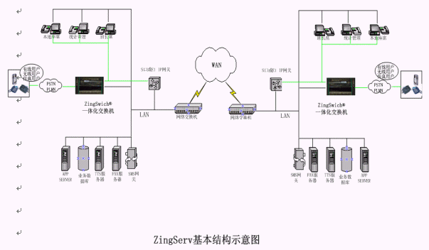 硬件:各點(diǎn)都有ZingSwitch®,S口網(wǎng)關(guān)和CO8卡或E1 接口網(wǎng)關(guān)和E1卡。