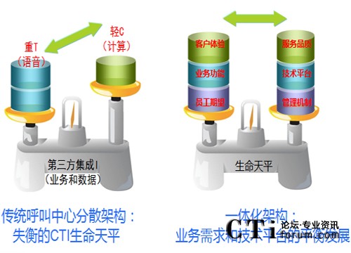 因此很長一段時間以來呼叫中心都作為語音通訊的分支之一而存在,而這種定位給呼叫中心的生命力帶來了不平衡的發(fā)展,根源就在于“輕C重T第三方集成I”的格局:語音處理性能和功能強大,計算能力和數(shù)據(jù)處理弱,因此將業(yè)務(wù)集成和數(shù)據(jù)集成交由第三方承擔(dān)。因此很長一段時間,造成呼叫中心在企業(yè)購買之后對業(yè)務(wù)應(yīng)用的適應(yīng)能力差、業(yè)務(wù)發(fā)展和變化時系統(tǒng)穩(wěn)定性變的無法保證。