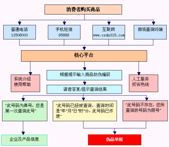 通過登錄www.csdn315.com,進行商品真?zhèn)蔚牟樵,同時可以等到商品許多有用的相關信息。通過網(wǎng)站還將獲取防偽的相關資訊、購物指導性建議、國家有關的防偽法律知識;