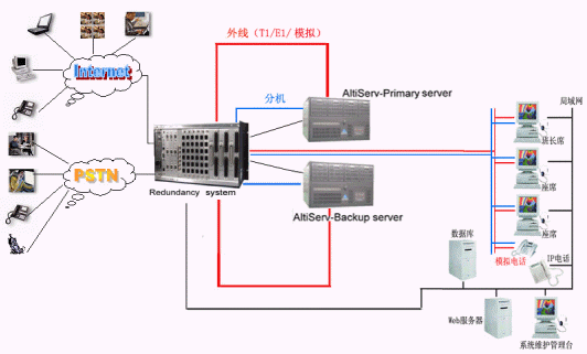 奧迪堅(jiān)通訊系統(tǒng)有限公司作為CTI通訊平臺(tái)的提供商,在技術(shù)上不斷創(chuàng)新,對產(chǎn)品精益求精,尤其體現(xiàn)在對系統(tǒng)的運(yùn)行安全性的要求上,為了防止電信接入設(shè)備或者企業(yè)網(wǎng)絡(luò)出現(xiàn)故障而造成的呼叫中心服務(wù)中斷,奧迪堅(jiān)呼叫中心系統(tǒng)提供安全保護(hù)冗余切換系統(tǒng),來保障呼叫中心在意外情況下的正常工作,該安全冗余切換系統(tǒng)通過對電源、T1/E1、模擬trunk、分機(jī)座席、以及各種網(wǎng)絡(luò)鏈路串口等備份切換來實(shí)現(xiàn)可靠的運(yùn)行。除此之外,奧迪堅(jiān)系統(tǒng)本身也提供強(qiáng)大的安全保障,由于采用先進(jìn)IP內(nèi)核一體化設(shè)計(jì),集傳統(tǒng)PBX、CTI服務(wù)器、IVR、ACD、Recording、FAX等眾多設(shè)備于一體,這樣有效的避免了因?yàn)橥鈷煸O(shè)備過多以及設(shè)備供應(yīng)商的不同而存在的兼容性的問題,從而降低了給呼叫中心系統(tǒng)帶來的的不穩(wěn)定的安全隱患。在系統(tǒng)之外依靠安全保護(hù)冗余切換系統(tǒng),可以實(shí)現(xiàn)外線、分機(jī)、以及各種鏈路接口的雙倍安全運(yùn)行。如上圖所示:兩臺(tái)奧迪堅(jiān)的呼叫中心服務(wù)器和奧迪堅(jiān)安全冗余切換系統(tǒng)構(gòu)成呼叫中心熱備份系統(tǒng),在兩臺(tái)服務(wù)器中安裝所有的呼叫中心功能模塊。通常情況下由主呼叫中心服務(wù)器提供系統(tǒng)的正常運(yùn)行,備份服務(wù)器通過安全保護(hù)冗余切換系統(tǒng)的服務(wù)監(jiān)測模塊來監(jiān)測主服務(wù)器的各項(xiàng)設(shè)備和鏈路的使用情況,當(dāng)主服務(wù)器遭遇突發(fā)故障不能繼續(xù)工作時(shí),系統(tǒng)馬上實(shí)施自動(dòng)切換,就會(huì)通過安全保護(hù)冗余切換系統(tǒng)將系統(tǒng)切換到備份的呼叫中心系統(tǒng)上來,此鏈路可以是數(shù)據(jù)、語音、網(wǎng)絡(luò)、串口等。當(dāng)安全保護(hù)冗余切換系統(tǒng)自身出現(xiàn)斷電或者其他故障時(shí),所有鏈路均保持正常工作狀態(tài)。