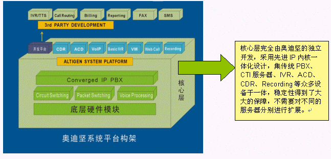 交換功能作為整個系統(tǒng)的核心功能,是系統(tǒng)一切功能的基礎(chǔ)。奧迪堅高度一體化通訊服務(wù)器AltiServ,采用先進的DSP等技術(shù),將傳統(tǒng)的語音交換和IP包交換在系統(tǒng)底層實現(xiàn),使系統(tǒng)的技術(shù)水平、功能及穩(wěn)定性達到了一個新的高度,可以實現(xiàn)大容量電話的呼入/呼出處理、電話轉(zhuǎn)接、支持PRI、E1、中國一號信令、七號信令、模擬線路等多種接入方式,同時還具備傳統(tǒng)PBX所不具備的強大的語音信箱、電話會議功能、VoIP、界面友好的系統(tǒng)管理功能等。由于在底層對VoIP支持,所以既可以使用普通電話機,也可以使用IP話機或者軟電話登陸到系統(tǒng),豐富了用戶的選擇的范圍,方便了用戶使用并節(jié)省投資,并且VoIP技術(shù)擴展了增值空間,可以用IP座席輕松構(gòu)建遠程專家座席,更加適合互聯(lián)網(wǎng)時代的應(yīng)用。