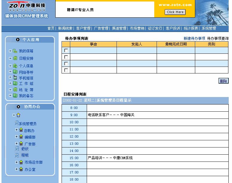 協(xié)同CRM實現(xiàn)單位內部各個部門、各地分支機構、代理商以客戶為中心協(xié)同工作,具體功能包括對新聞線索的管理,對廣告的管理,對征訂發(fā)行的管理,客戶反饋的管理,客戶信息分析決策,競爭對手管理、檢索統(tǒng)計輸出、系統(tǒng)維護等模塊。