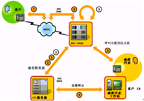 ②呼叫到達(dá)業(yè)務(wù)交換機(jī)并通知服務(wù)器(ANI –自動(dòng)號(hào)碼識(shí)別)