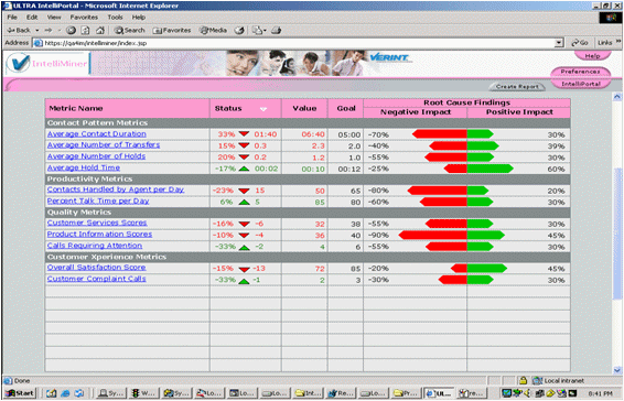 IntelliMiner使用專利的數(shù)據(jù)挖掘技術,自動分析導致呼叫中心關鍵行為指標(KPI)和呼叫中心設定目標的因素及其關系和影響。所分析的數(shù)據(jù)揭示了導致呼叫中心KPI表現(xiàn)的潛在原因,例如過長的通話時間,過多的轉(zhuǎn)接次數(shù),過長的保持時間,降低生產(chǎn)力和降低客戶滿意度。針對分析的結(jié)果,用戶可以去回放相關的呼叫,找到導致這些因素的原因所在。