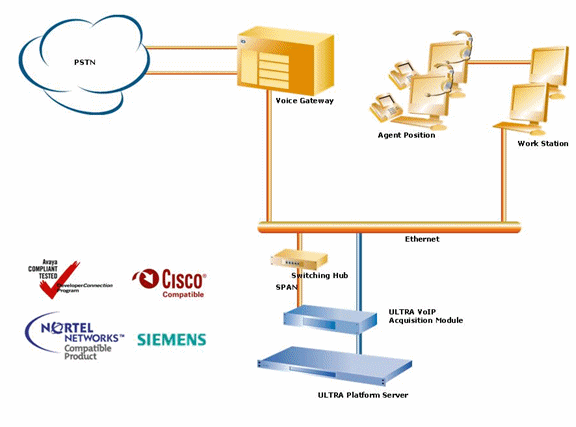 ULTRA平臺的VoIP錄音方案可真正實現(xiàn)純軟件解決方案,可由客戶自行配置符合要求的錄音服務器,安裝ULTRA平臺的軟件即可。另外,對于不能提供具備SPAN功能的網(wǎng)絡使用環(huán)境,ULTRA平臺也可提供相應的模塊產(chǎn)品(ULTRA
