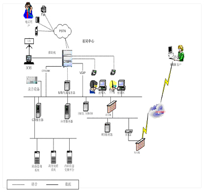 2 ) CTI(計(jì)算機(jī)電話集成)服務(wù)器:通過該平臺(tái)實(shí)現(xiàn)計(jì)算機(jī)網(wǎng)絡(luò)與電話系統(tǒng)的無縫結(jié)合,可通過計(jì)算機(jī)應(yīng)用系統(tǒng)對(duì)話務(wù)處理進(jìn)行操作;