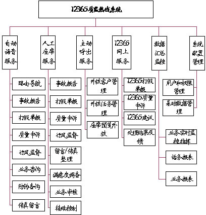 系統(tǒng)主要功能有:事故報(bào)告、打假舉報(bào)、質(zhì)量申訴、行風(fēng)監(jiān)督、業(yè)務(wù)咨詢、防偽查詢、主動(dòng)呼出、網(wǎng)上服務(wù)、統(tǒng)計(jì)分析、數(shù)據(jù)匯總監(jiān)控等。