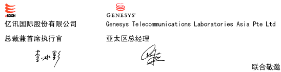屆時,不僅有Genesys全球總裁率領(lǐng)資深專家向您介紹客戶關(guān)系管理領(lǐng)域的市場動向與未來趨勢,還帶來了全球拭目以待、發(fā)熱發(fā)光的Genesys最新產(chǎn)品 ── G7。此外主辦單位更有幸請來兩岸三地知名客戶,提供商務(wù)應(yīng)用實例,共同分享其成功經(jīng)驗,為您的企業(yè)及同行業(yè)提供了相互交流的機(jī)會。